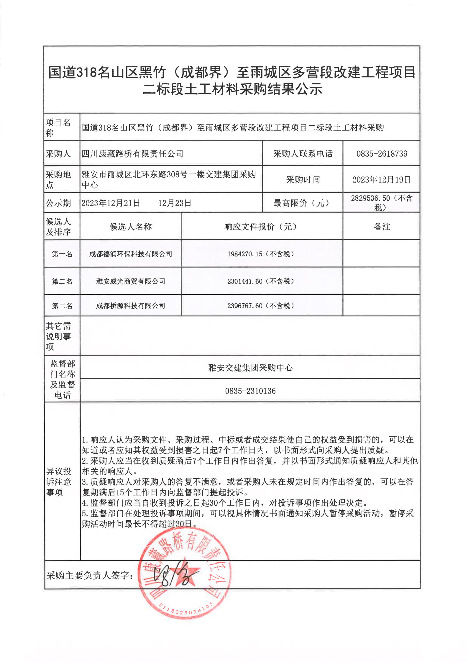 四川康藏路橋有限責(zé)任公司國道318名山區(qū)黑竹(成都界)至雨城區(qū)多營段改建工程項(xiàng)目二標(biāo)段土工材料采購結(jié)果公示