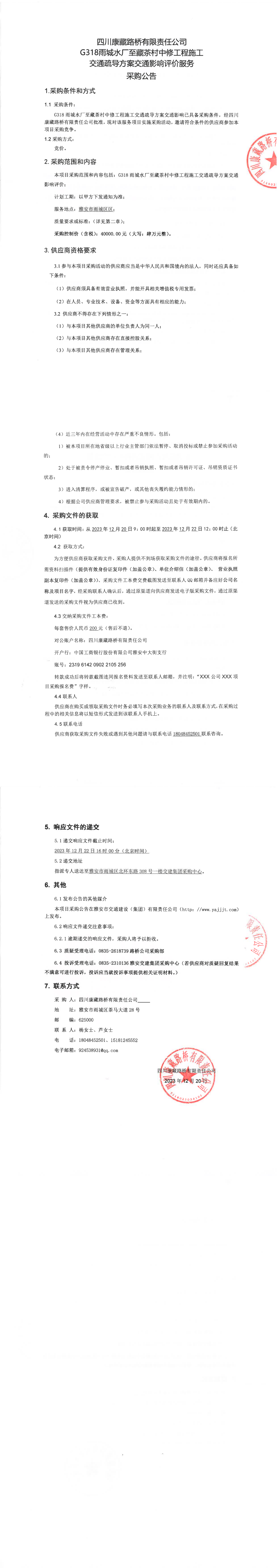 四川康藏路橋有限責(zé)任公司G318雨城水廠至藏茶村中修工程施工交通疏導(dǎo)方案交通影響評(píng)價(jià)服務(wù)采購公告