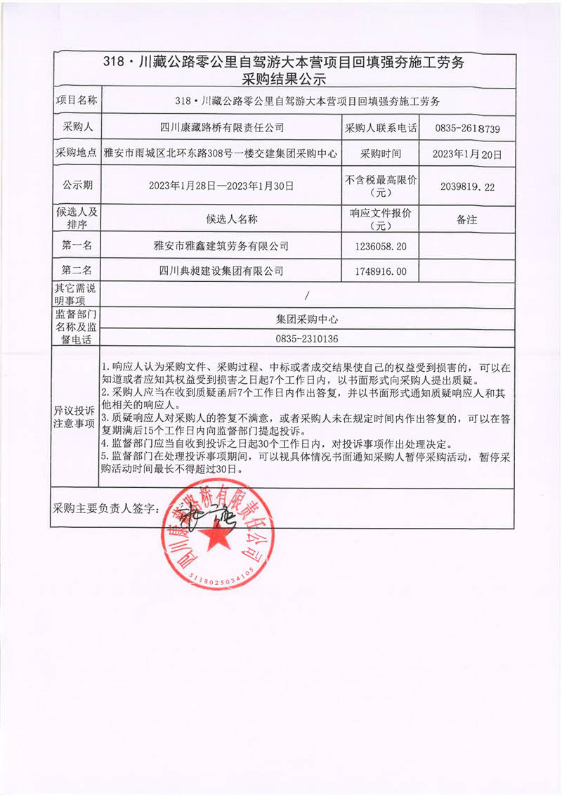 四川康藏路橋有限責(zé)任公司318.川藏公路零公里自駕游大本營項目回填強夯施工勞務(wù)采購結(jié)果公示