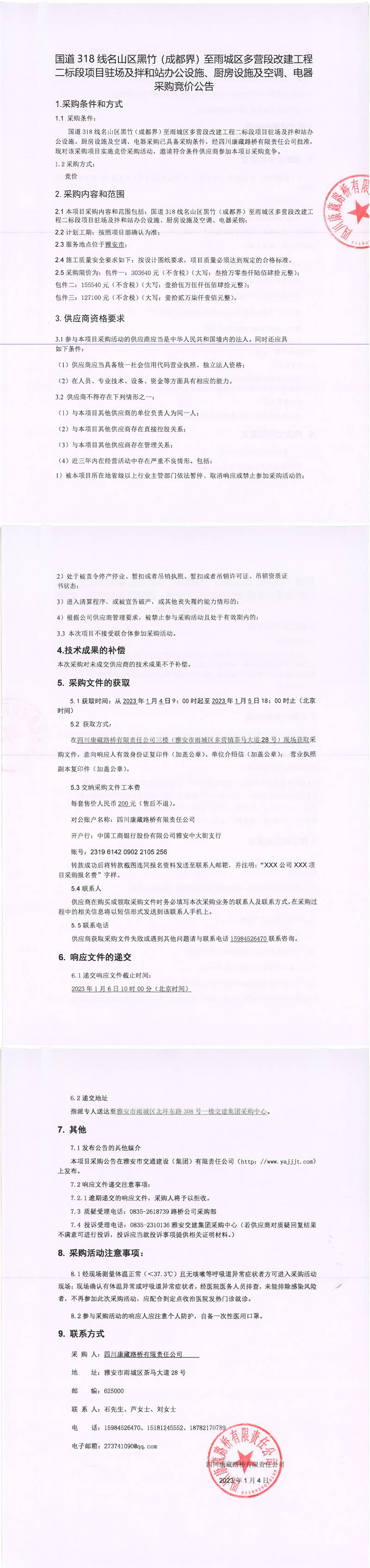 四川康藏路橋有限責(zé)任公司國道318線名山區(qū)黑竹(成都界)至雨城區(qū)多營段改建工程二標(biāo)段項(xiàng)目駐場及拌和站辦公設(shè)施、廚房設(shè)施及空調(diào)、電器采購競價(jià)公告