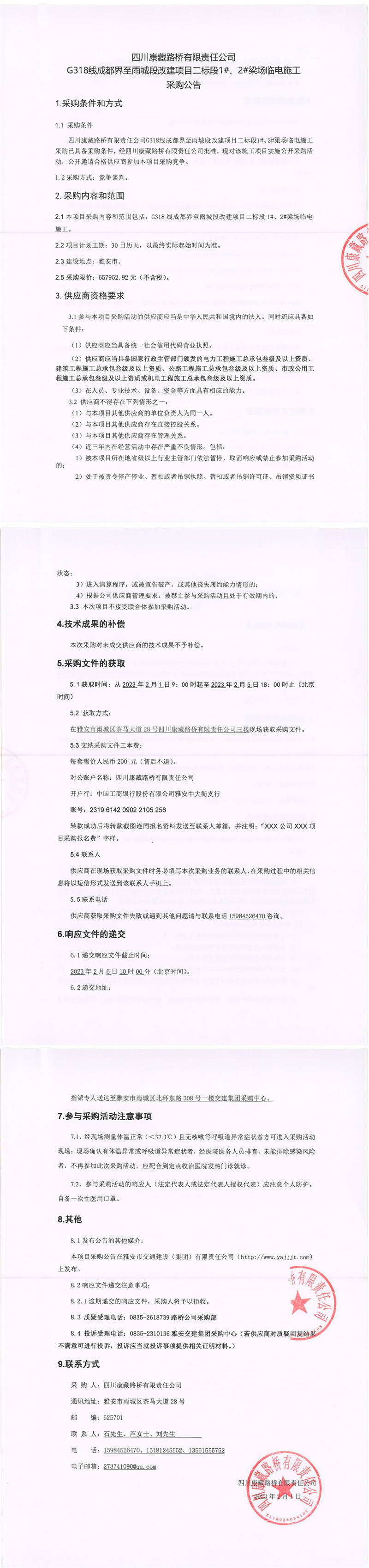四川康藏路橋有限責(zé)任公司G318線成都界至雨城段改建項目二標(biāo)段1#、2#梁場臨電施工采購公告