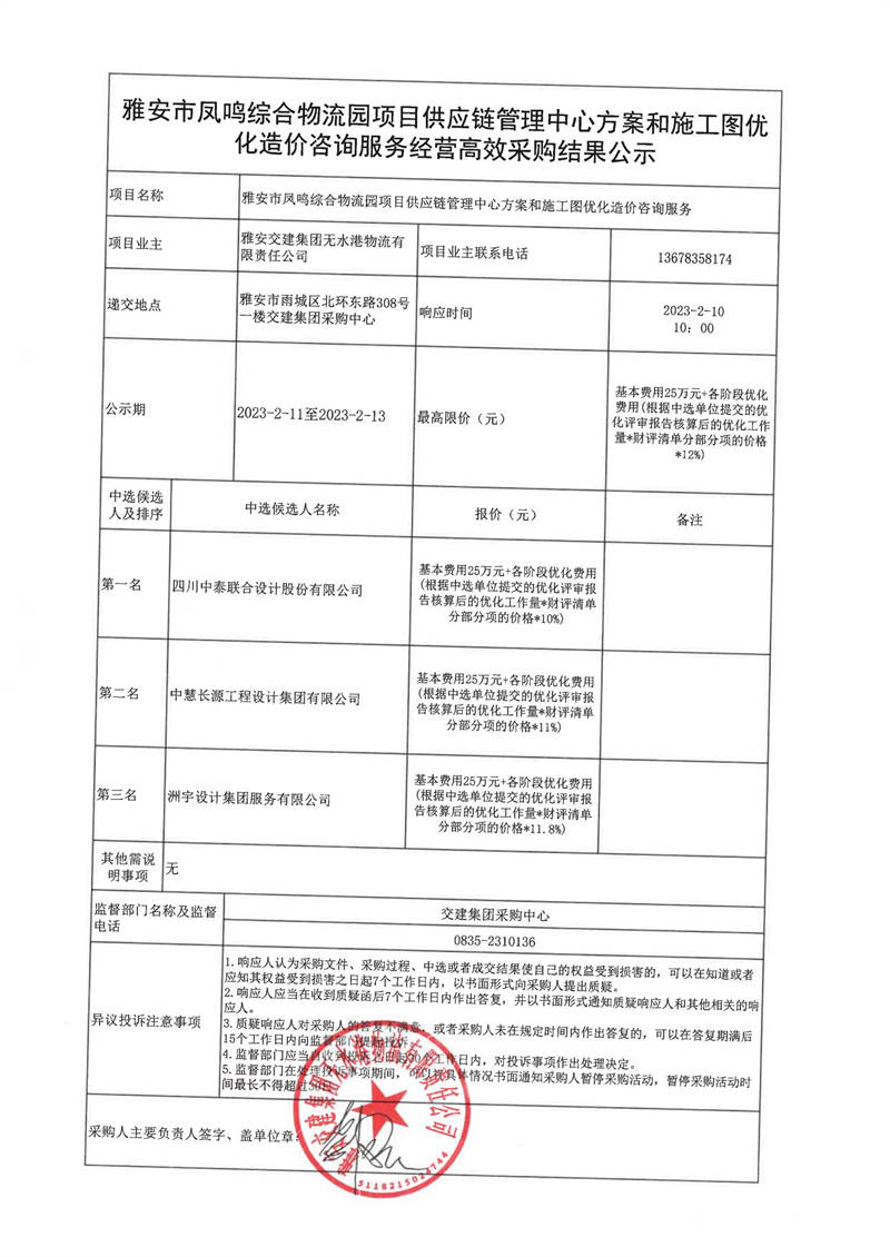 雅安交建集團無水港物流有限責任公司雅安市鳳鳴綜合物流園項目供應鏈管理中心方案和施工圖優(yōu)化造價咨詢服務經(jīng)營高效采購結(jié)果公示