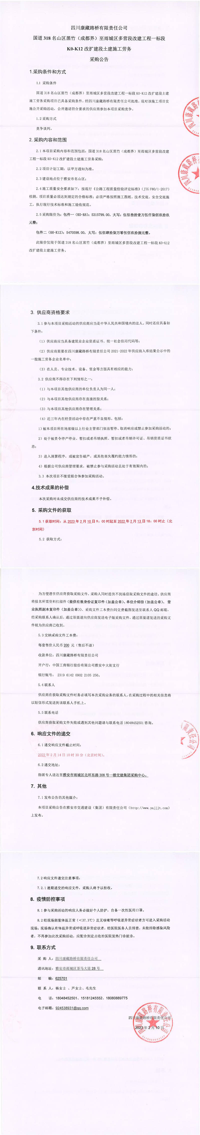 四川康藏路橋有限責(zé)任公司國道318名山區(qū)黑竹(成都界)至雨城區(qū)多營段改建工程一標段K0-K12改擴建段土建施工勞務(wù)采購公告