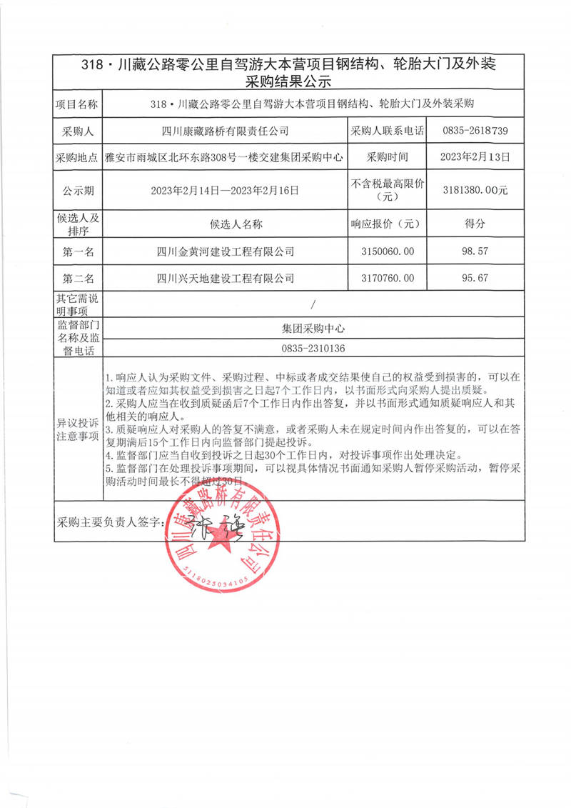 四川康藏路橋有限責任公司318.川藏公路零公里自駕游大本營項目鋼結構、輪胎大門及外裝采購結果公示