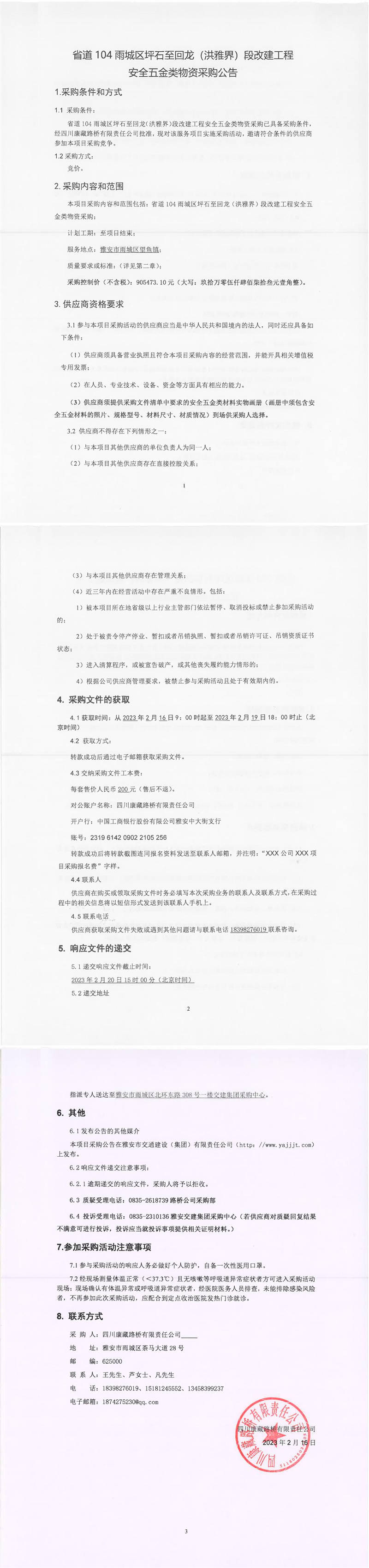 四川康藏路橋有限責任公司省道104雨城區(qū)坪石至回龍(洪雅界)段改建工程安全五金類物資采購公告