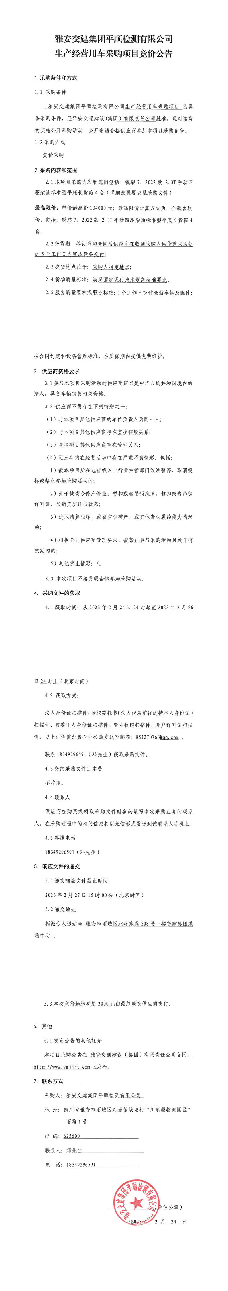 雅安交建集團(tuán)平順檢測(cè)有限公司生產(chǎn)經(jīng)營用車采購項(xiàng)目競(jìng)價(jià)公告