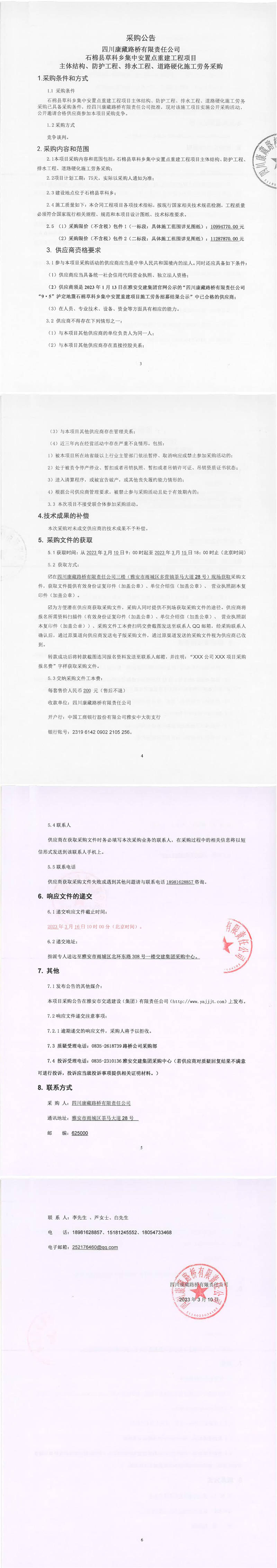 四川康藏路橋有限責(zé)任公司石棉縣草科鄉(xiāng)集中安置點(diǎn)重建工程項(xiàng)目主體結(jié)構(gòu)、防護(hù)工程、排水工程、道路硬化施工采購(gòu)公告