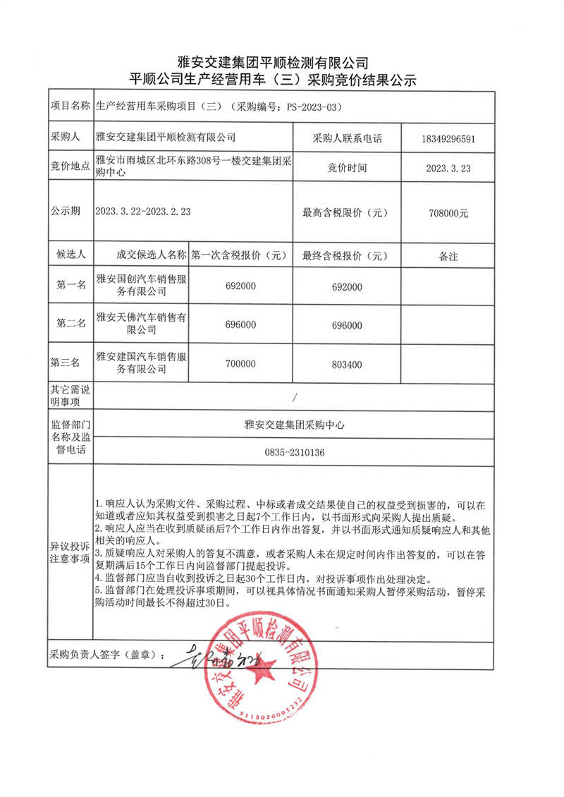 雅安交建集團(tuán)平順檢測(cè)有限公司平順公司生產(chǎn)經(jīng)營(yíng)用車(chē)(三)采購(gòu)競(jìng)價(jià)結(jié)果公示