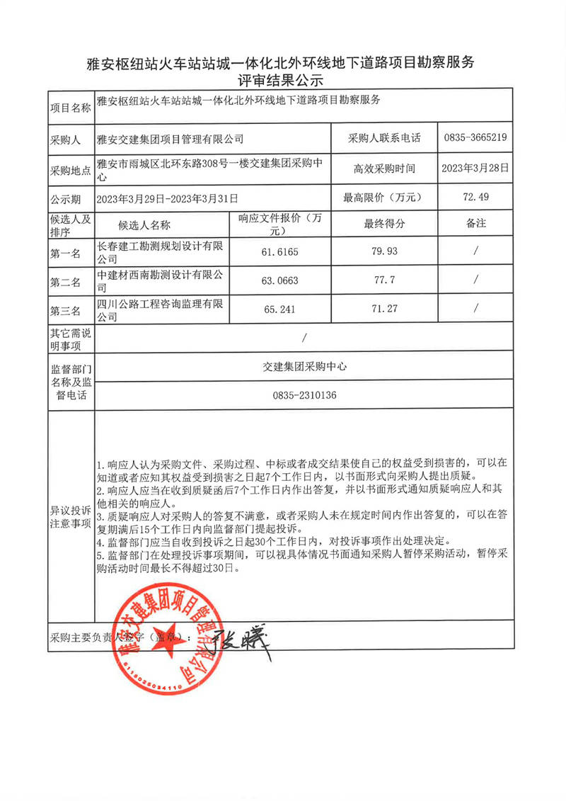 雅安交建集團項目管理有限公司雅安樞紐站火車站站城一體化北外環(huán)線地下道路項目勘察服務(wù)評審結(jié)果公示