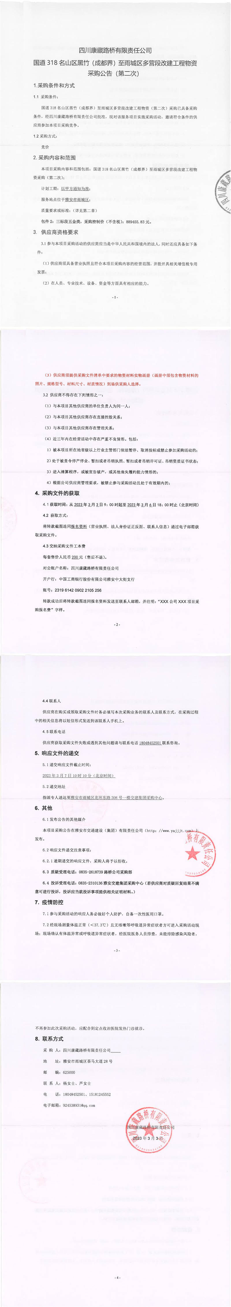 四川康藏路橋有限責(zé)任公司國(guó)道318名山區(qū)黑竹(成都界)至雨城區(qū)多營(yíng)段改建工程物資采購(gòu)公告(第二次)