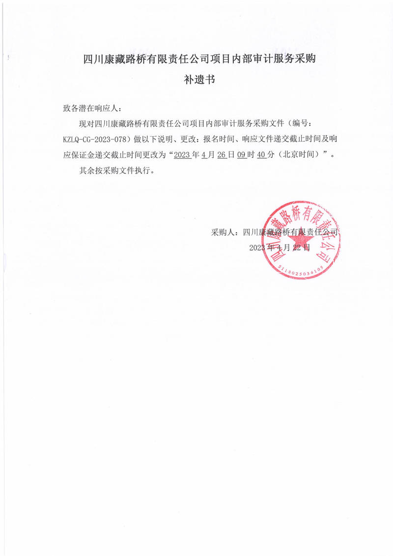 四川康藏路橋有限責(zé)任公司項(xiàng)目?jī)?nèi)部審計(jì)服務(wù)采購補(bǔ)遺書