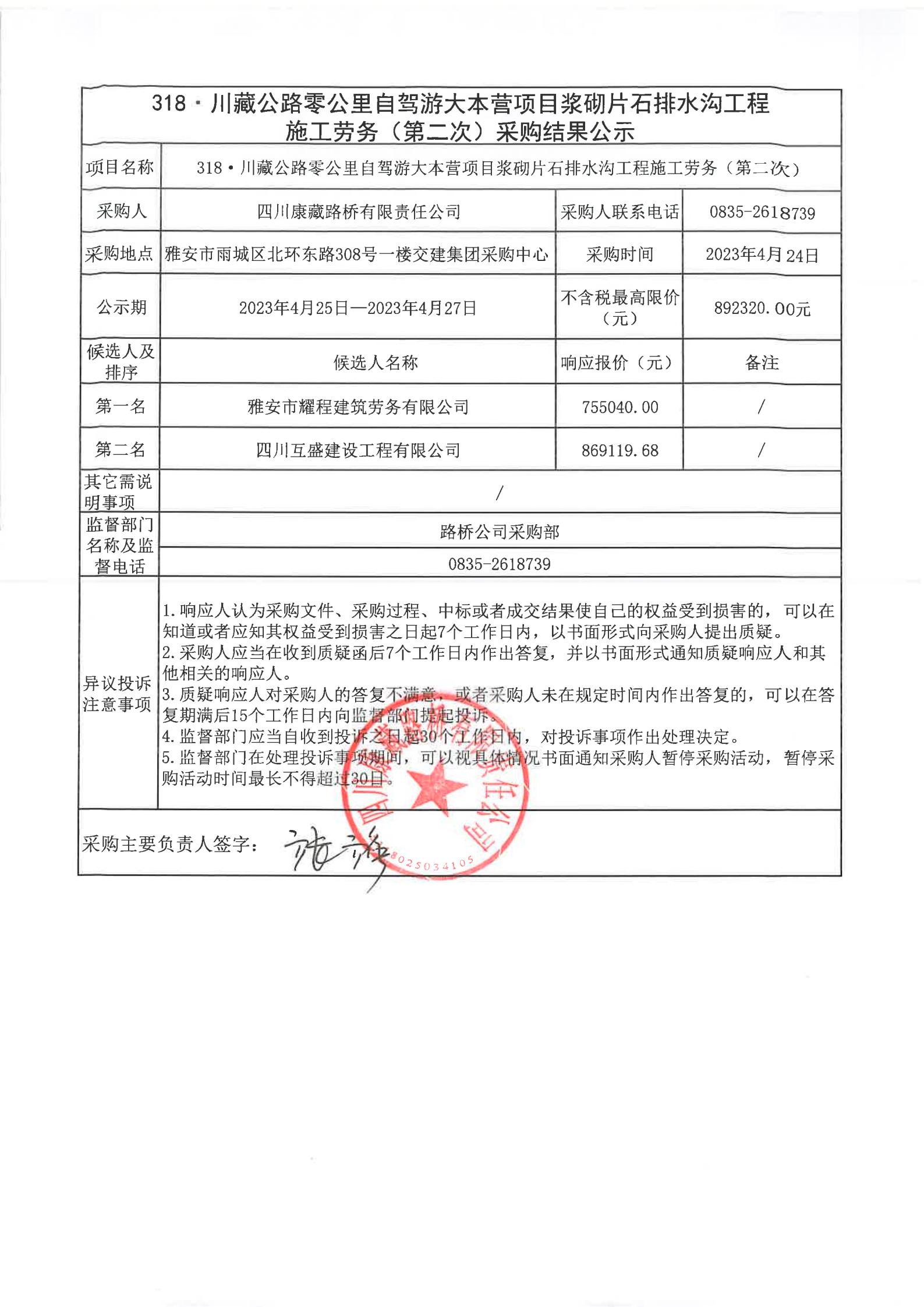 四川康藏路橋有限責(zé)任公司318·川藏公路零公里自駕游大本營項(xiàng)目漿砌片石排水溝工程施工勞務(wù)(第二次)采購結(jié)果公示