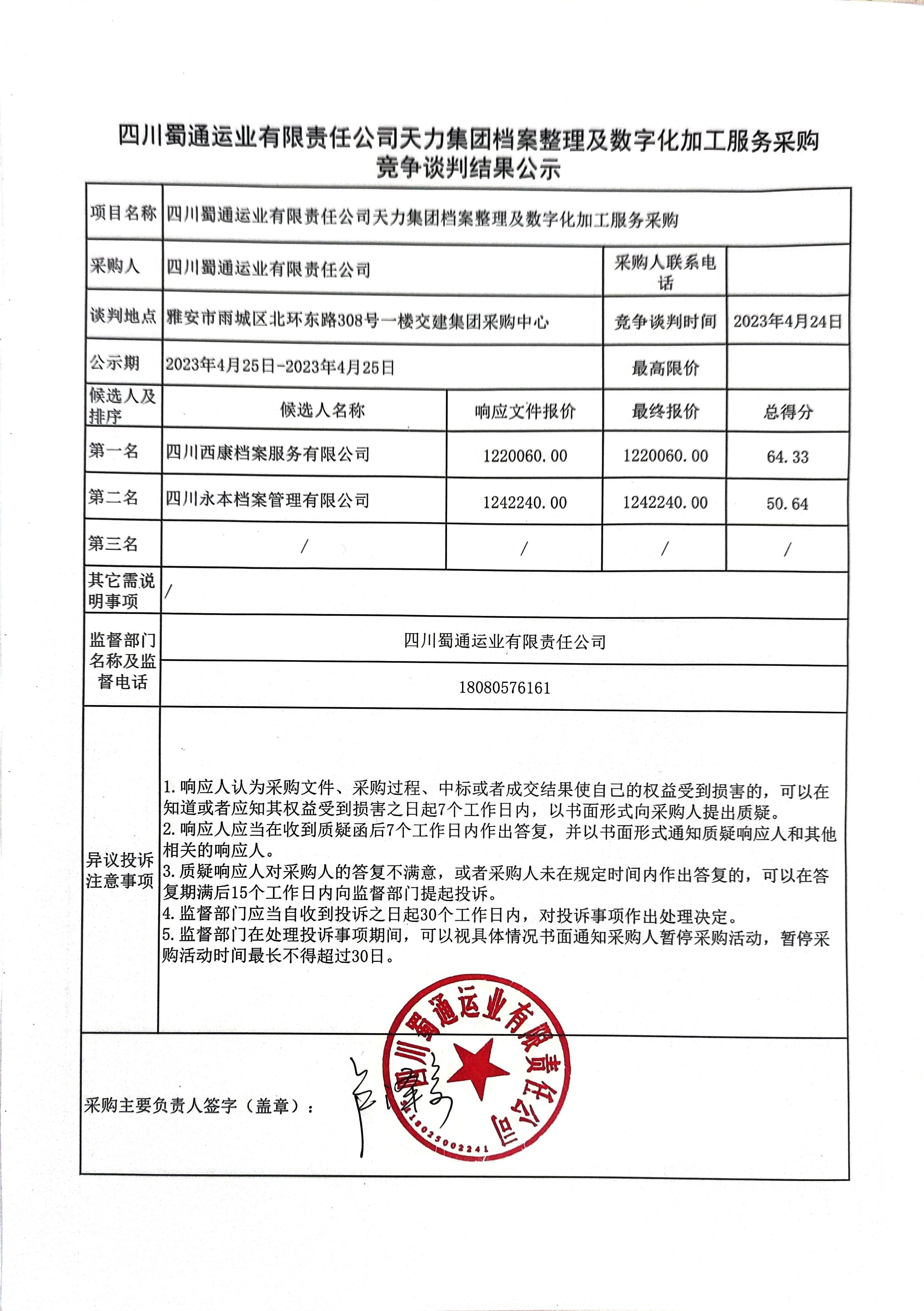 四川蜀通運業(yè)有限責任公司天力集團檔案整理及數(shù)字化加工服務采購競爭談判結果公示