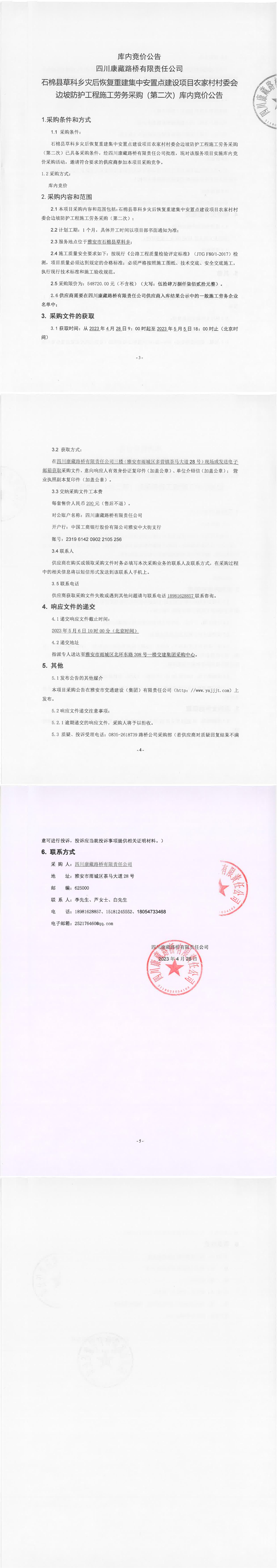 四川康藏路橋有限責任公司石棉草科鄉(xiāng)災后恢復重建集中安置點建設項目農家村村委會邊坡防護工程施工勞務采購(第二次)庫內競價公告