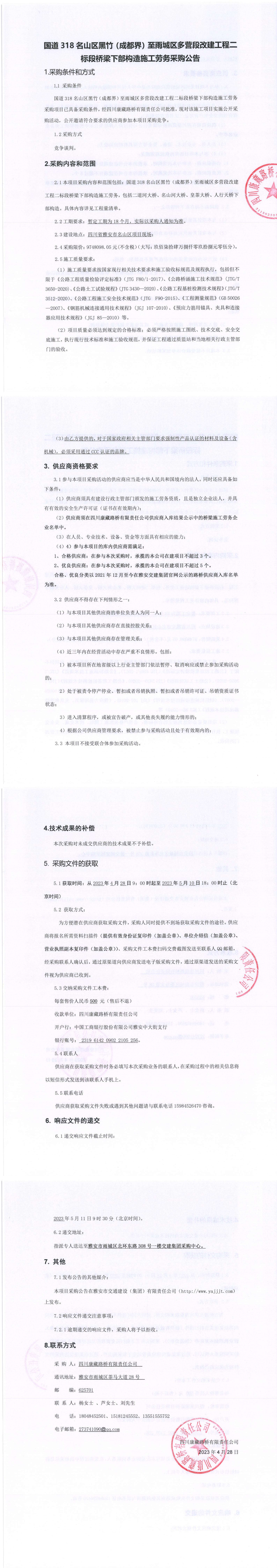 四川康藏路橋有限責(zé)任公司國道318名山區(qū)黑竹(成都界)至雨城區(qū)多營段改建工程一標(biāo)段橋梁施工勞務(wù)采購公告