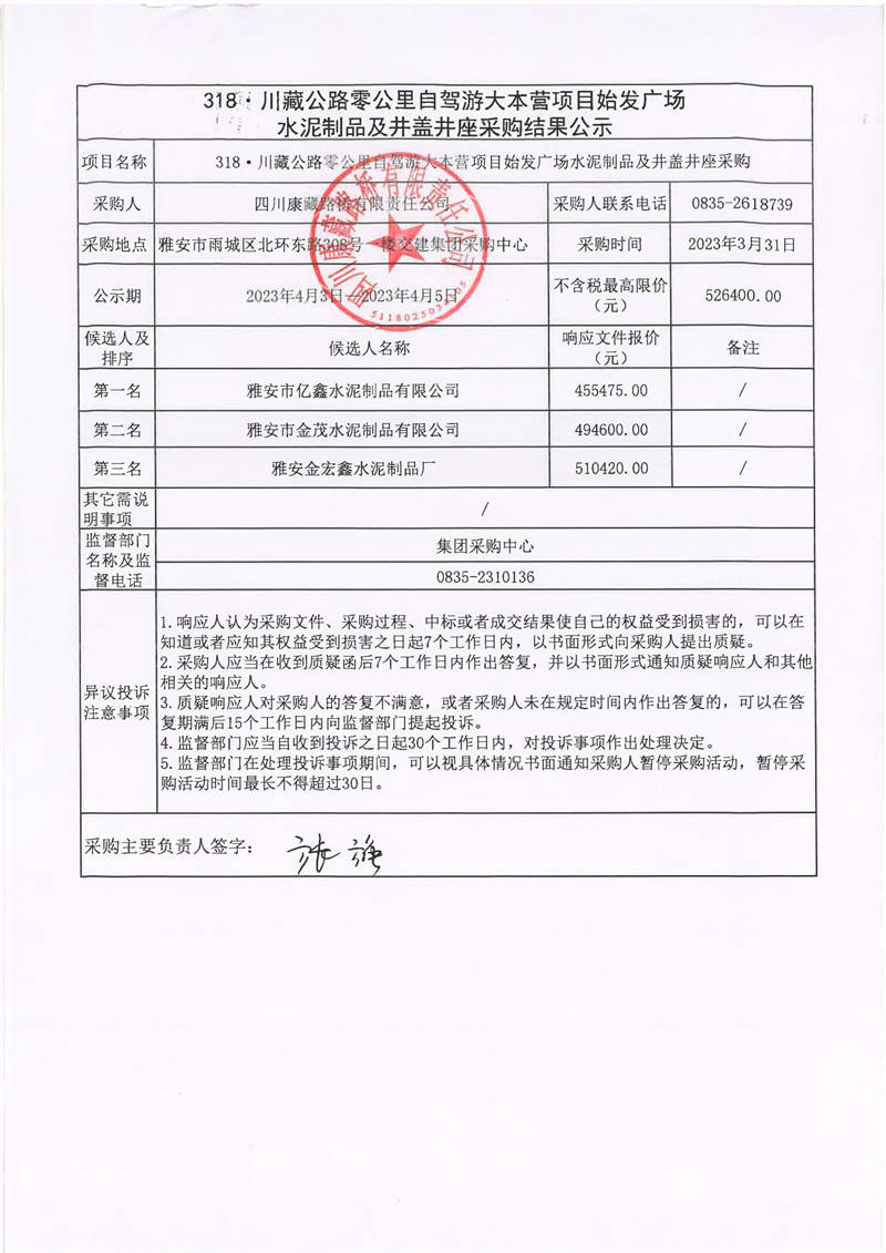 四川康藏路橋有限責任公司318·川藏公路零公里自駕游大本營項目始發(fā)廣場水泥制品及井蓋井座采購結果公示