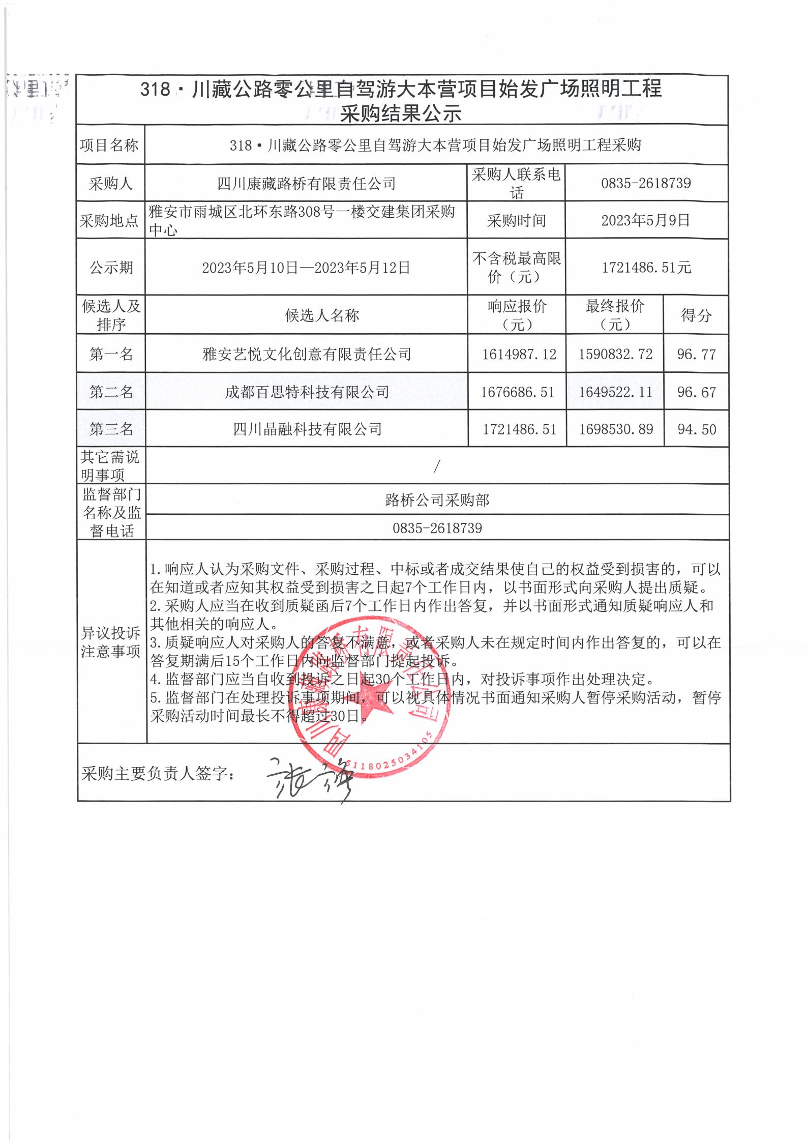 四川康藏路橋有限責(zé)任公司318·川藏公路零公里自駕游大本營項(xiàng)目始發(fā)廣場照明工程采購結(jié)果公示