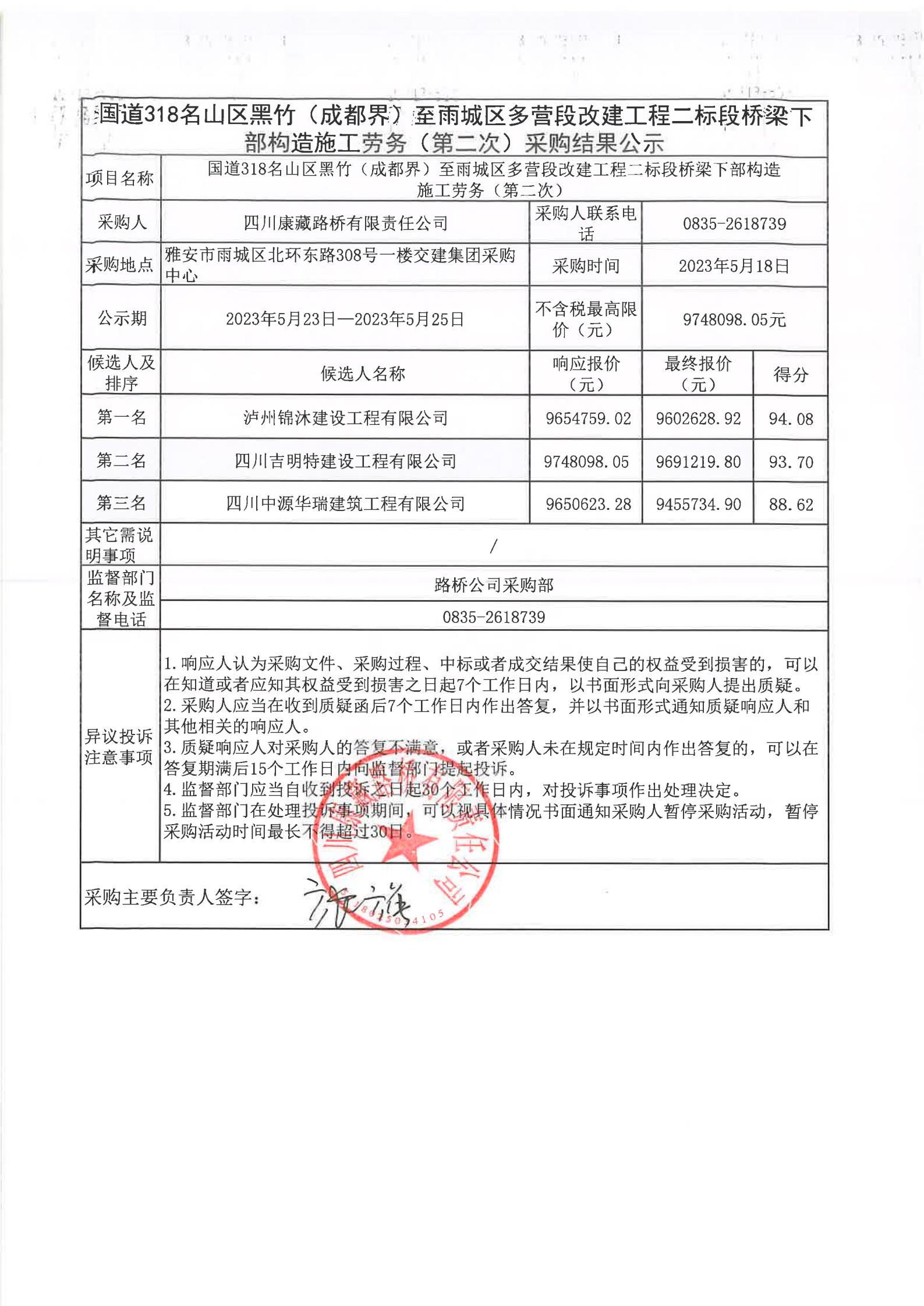 四川康藏路橋有限責(zé)任公司國(guó)道318名山區(qū)黑竹(成都界)至雨城區(qū)多營(yíng)段改建工程二標(biāo)段橋梁下部構(gòu)造施工勞務(wù)(第二次)采購(gòu)結(jié)果公示