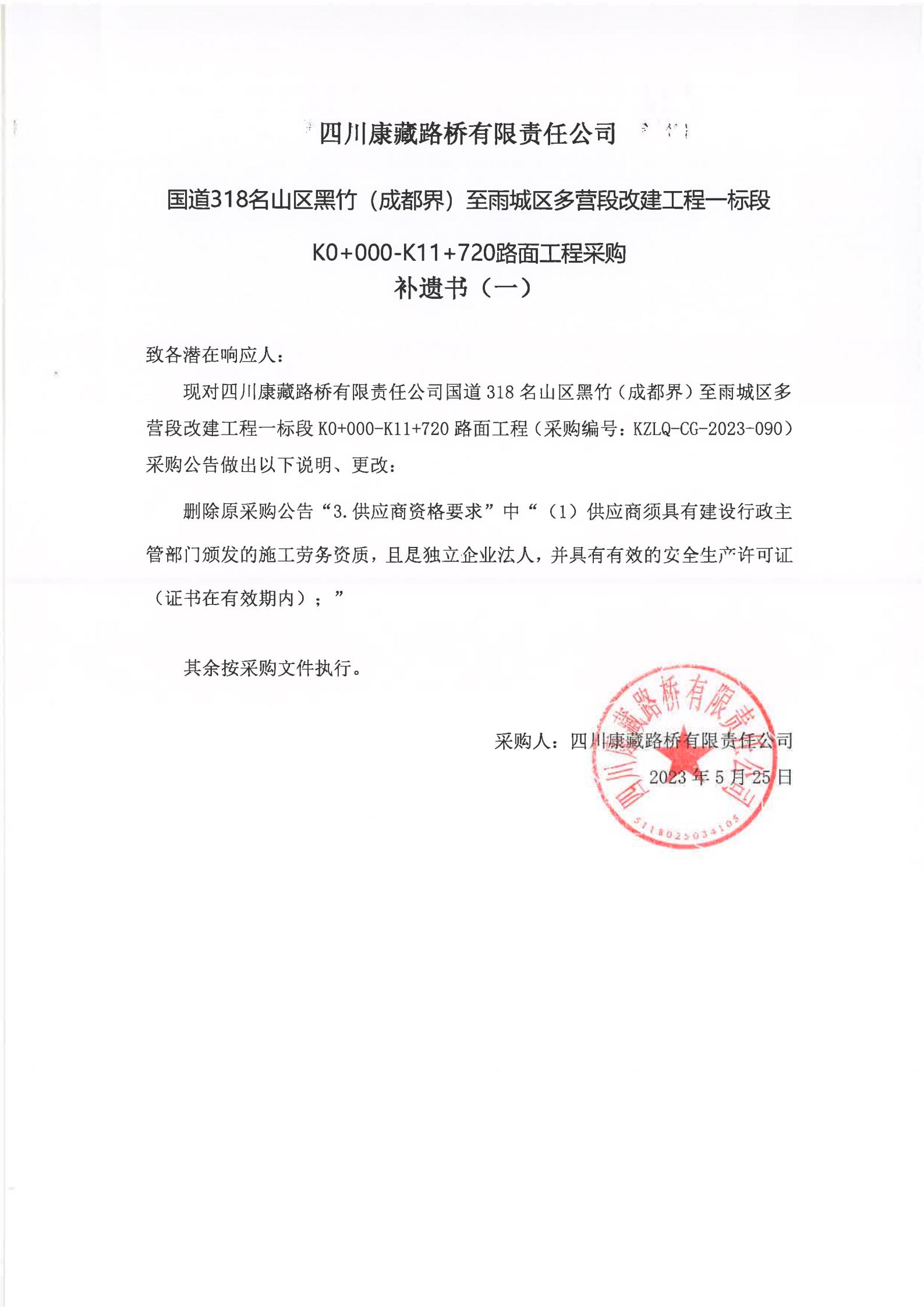 四川康藏路橋有限責任公司國道318名山區(qū)黑竹(成都界)至雨城區(qū)多營段改建工程一標段K0+000-K11+720路面工程采購補遺書(一)