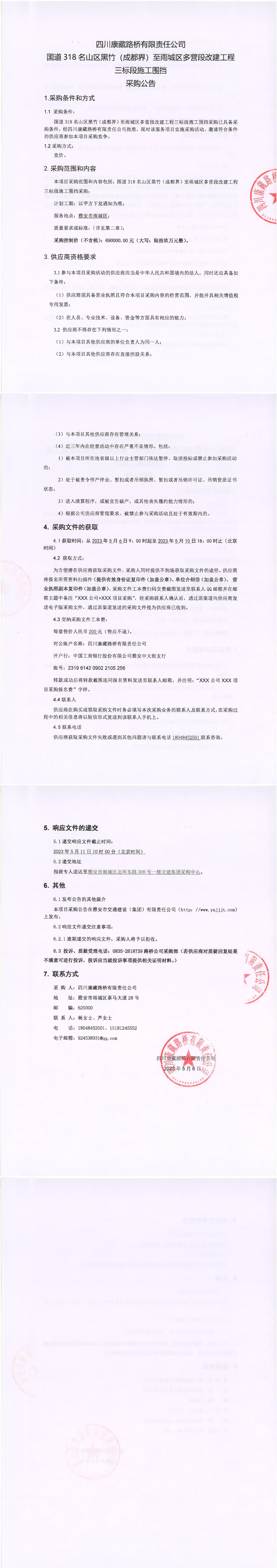 四川康藏路橋有限責任公司國道318名山區(qū)黑竹(成都界)至雨城區(qū)多營段改建工程三標段施工圍擋采購公告