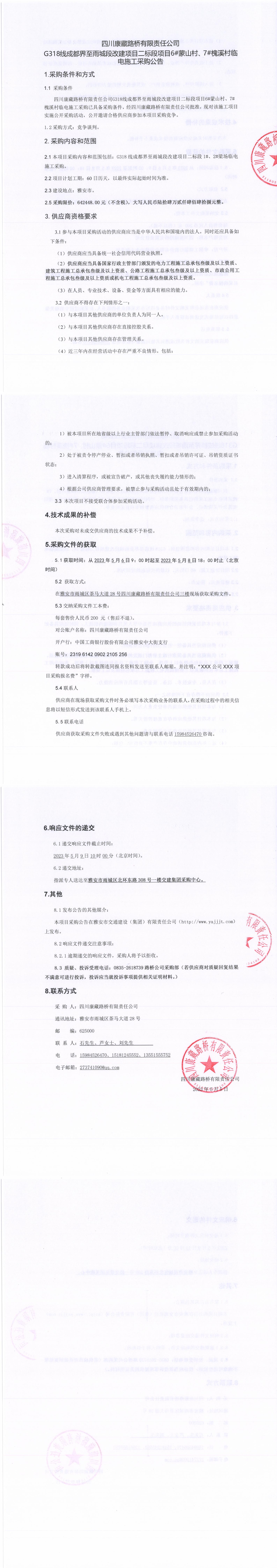 四川康藏路橋有限責(zé)任公司G318線成都至雨城段改建項(xiàng)目二標(biāo)段項(xiàng)目6#蒙山村、7#槐溪村臨時電施工采購公告