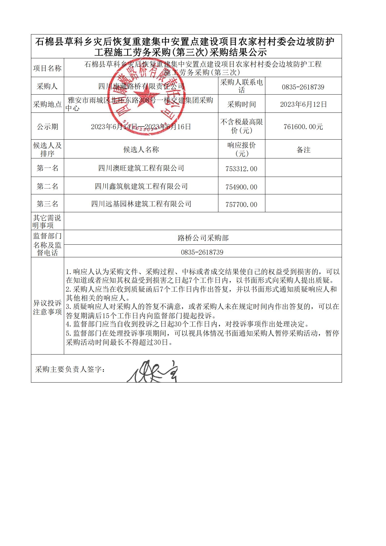 四川康藏路橋有限責任公司石棉縣草科鄉(xiāng)災(zāi)后恢復(fù)重建集中安置點建設(shè)項目農(nóng)家村村委會邊坡防護工程施工勞務(wù)采購(第三次)結(jié)果公示
