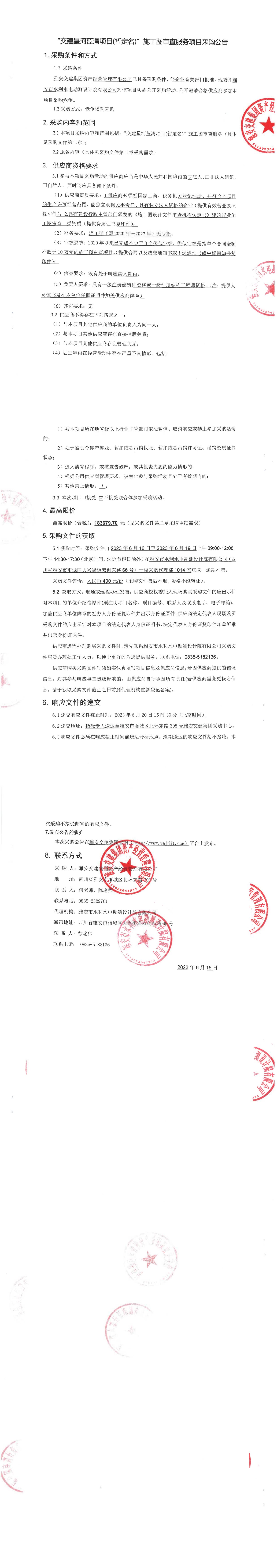 雅安交建集團(tuán)資產(chǎn)經(jīng)營管理有限公司“交建星河藍(lán)灣項目(暫定名)”施工圖審查服務(wù)項目采購公告
