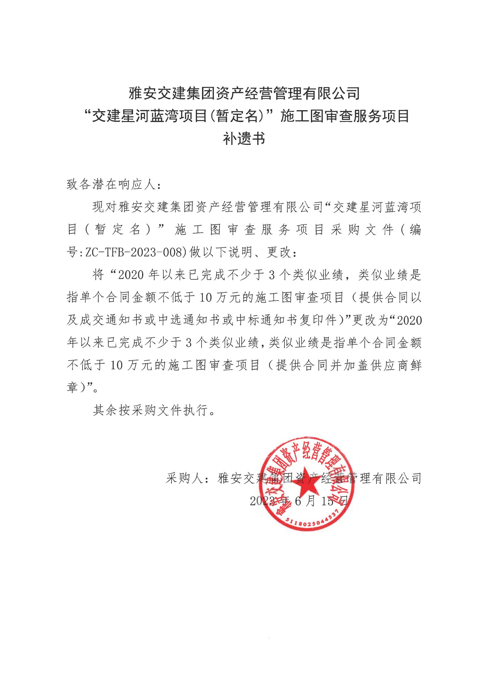 雅安交建集團資產經營管理有限公司“交建星河藍灣項目(暫定名)”施工圖審查服務項目采購補遺書