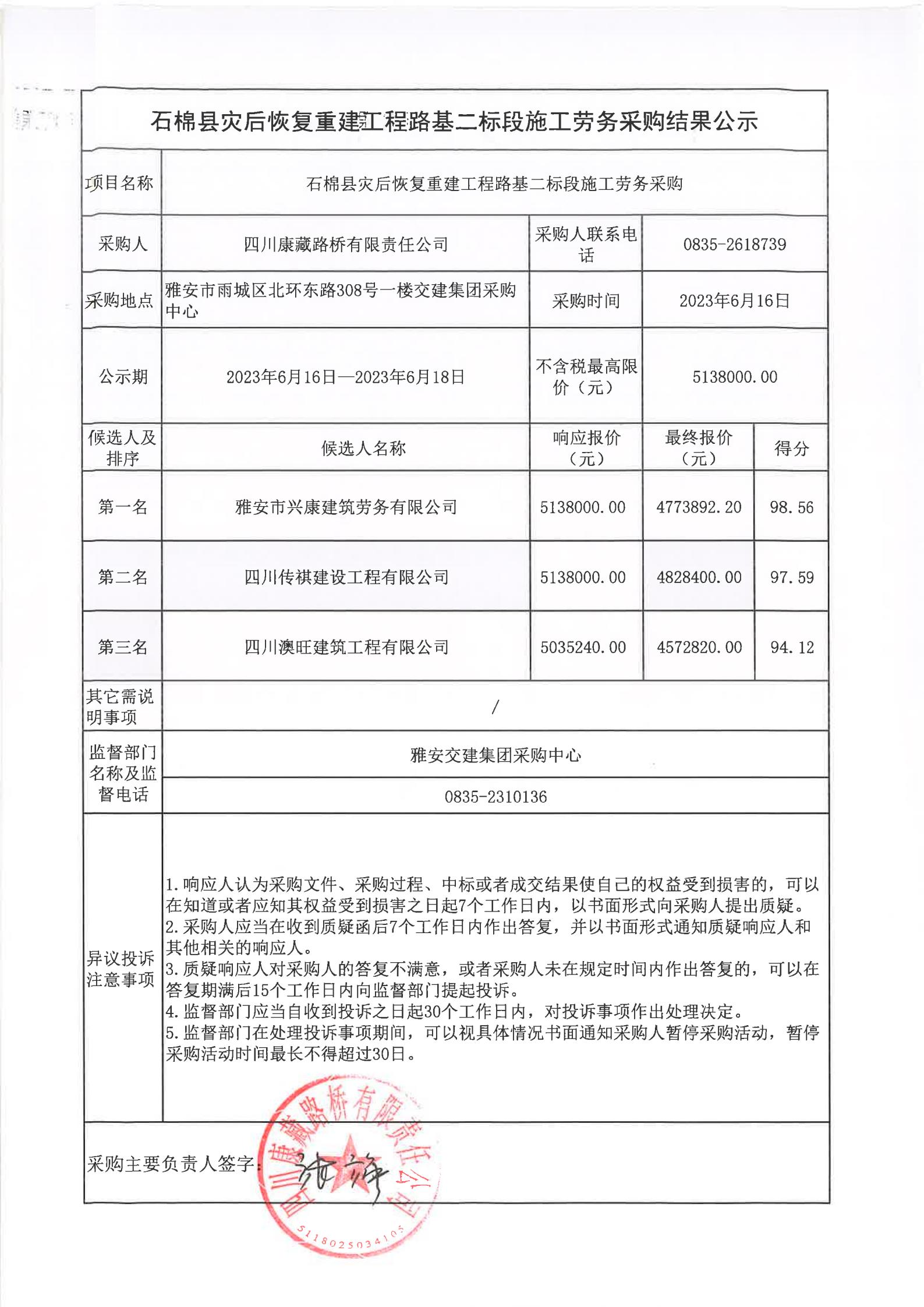 四川康藏路橋有限責任公司石棉縣災后恢復重建工程路基二標段施工勞務采購結(jié)果公示