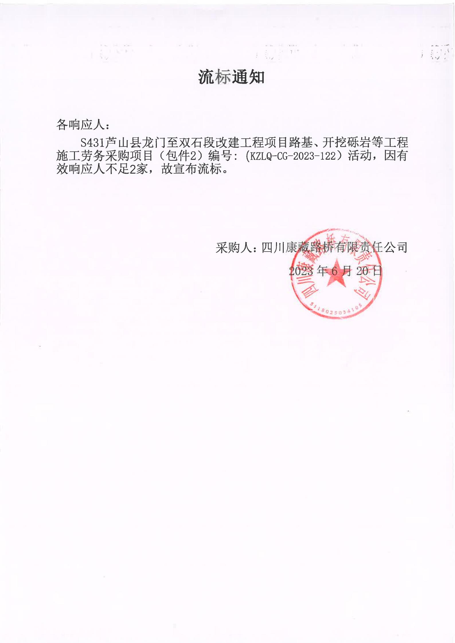 四川康藏路橋有限責(zé)任公司S431蘆山縣龍門至雙石段改建工程項(xiàng)目路基、開挖礫巖等工程施工勞務(wù)采購(gòu)(包件2)流標(biāo)通知