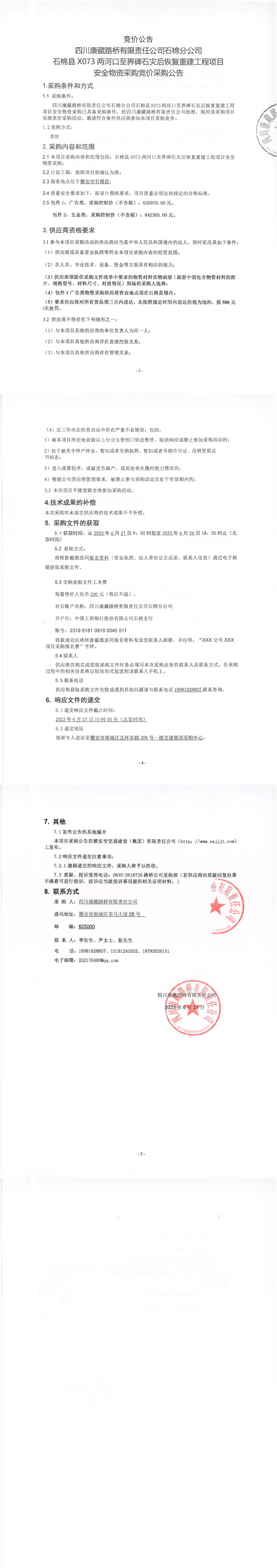 四川康藏路橋有限責(zé)任公司石棉分公司石棉縣X073兩河口至界碑石災(zāi)后恢復(fù)重建工程項目安全物資采購競價公告