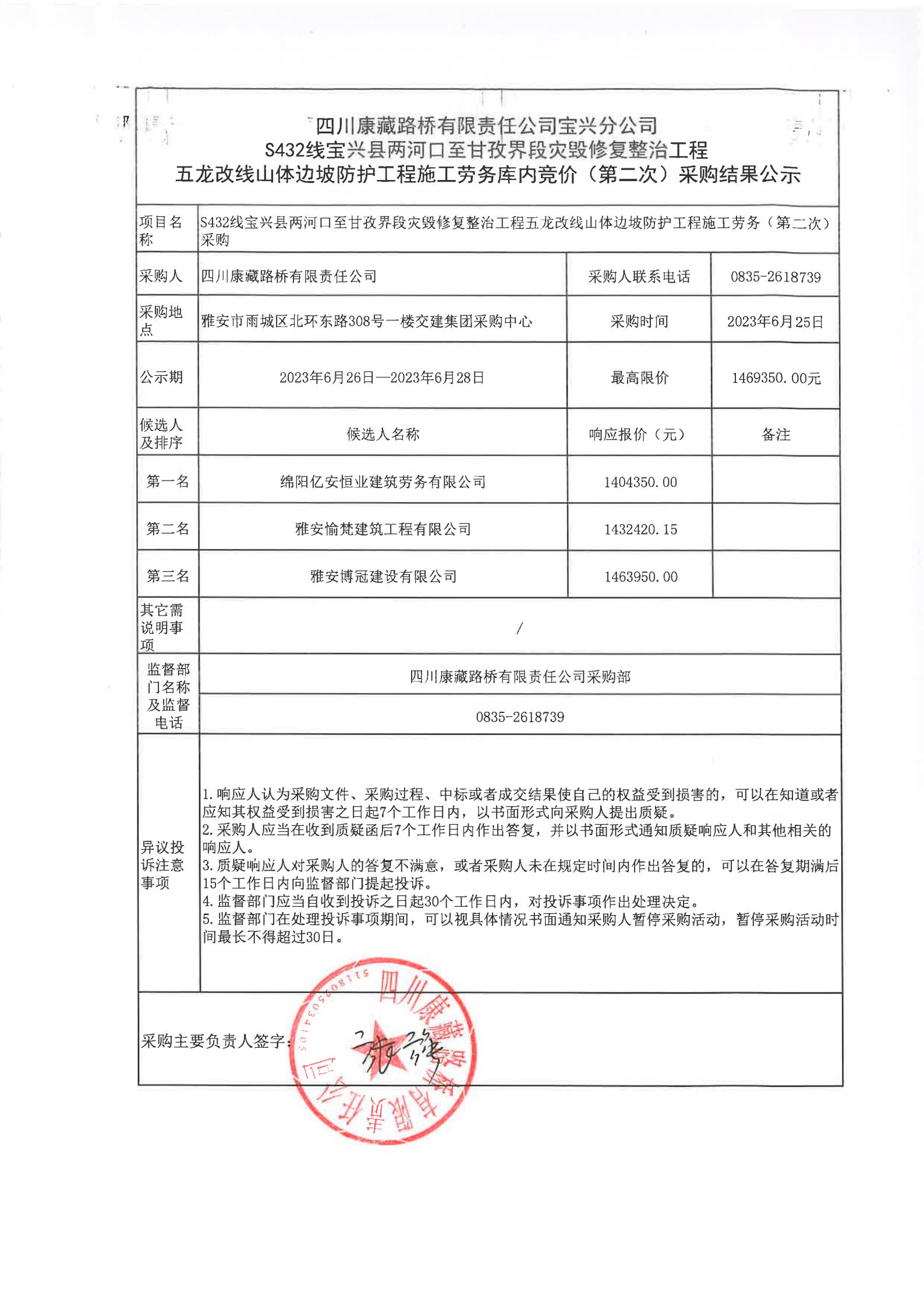 四川康藏路橋有限責(zé)任公司寶興分公司S432寶興縣兩河口至甘孜界段災(zāi)毀修復(fù)整治工程五龍改線山體邊坡防護工程施工勞務(wù)庫內(nèi)競價(第二次)結(jié)果公示