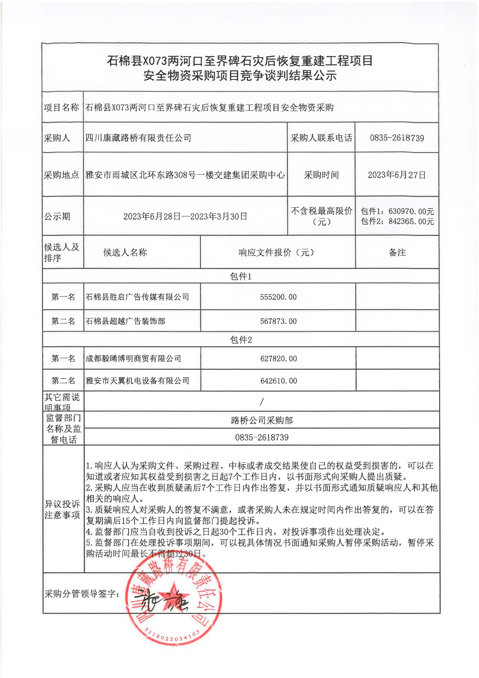 四川康藏路橋有限責任公司石棉縣X073兩河口至界碑石災后恢復重建工程項目安全物資采購項目競爭談判結果公示