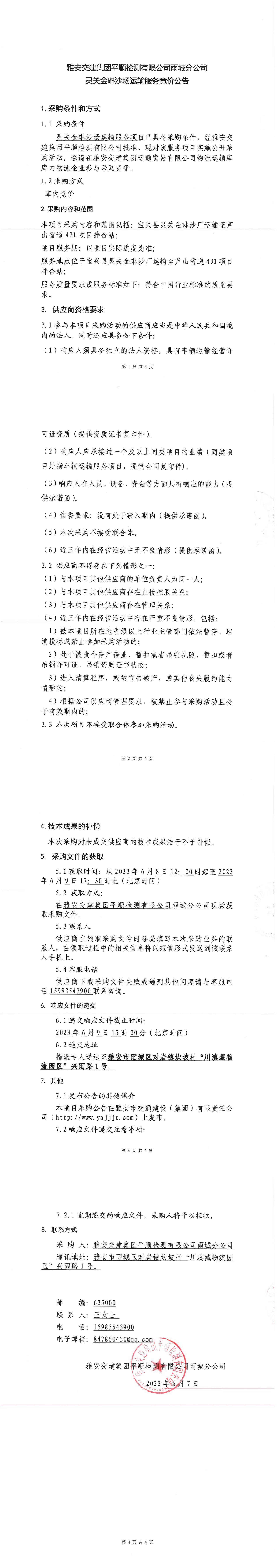 雅安交建集團(tuán)平順檢測有限公司雨城分公司靈關(guān)金琳沙場運(yùn)輸服務(wù)競價(jià)公告