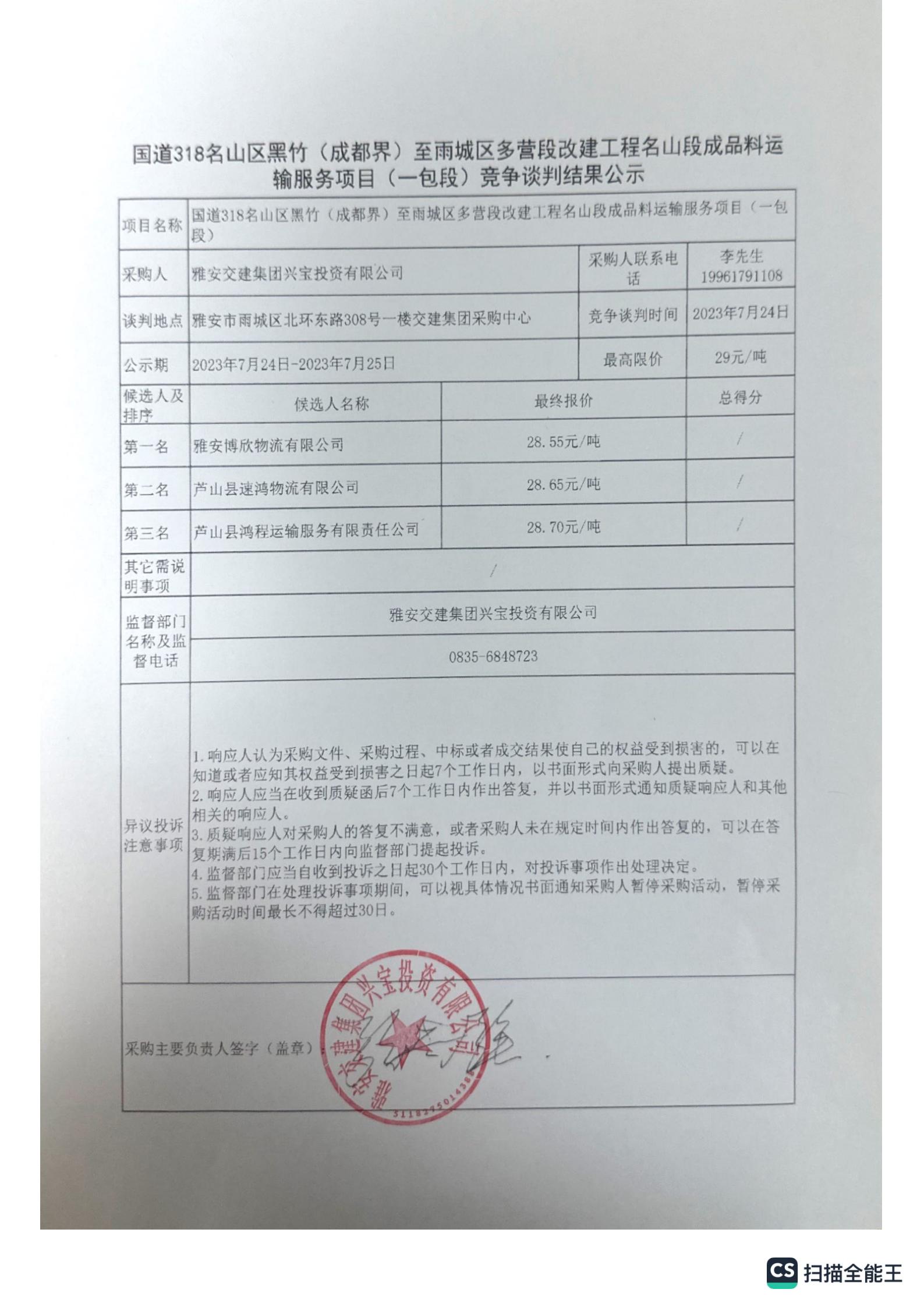 雅安交建集團興寶投資有限公司國道318名山區(qū)黑竹(成都界)至雨城區(qū)多營段改建工程名山段成品料運輸服務項目(一包段)競爭談判結果公示