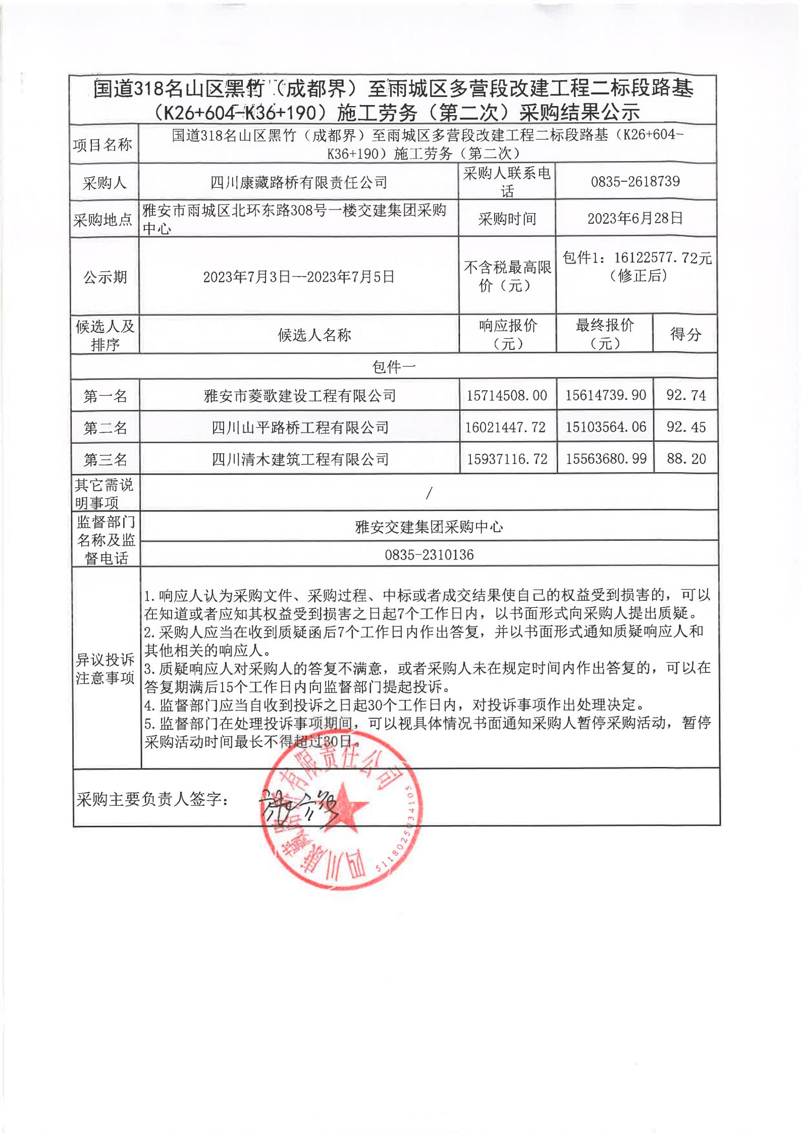 四川康藏路橋有限責(zé)任公司國道318名山區(qū)黑竹(成都界)至雨城區(qū)多營段改建工程二標(biāo)段路基(K26+604-K36+190)施工勞務(wù)(第二次)采購結(jié)果公示