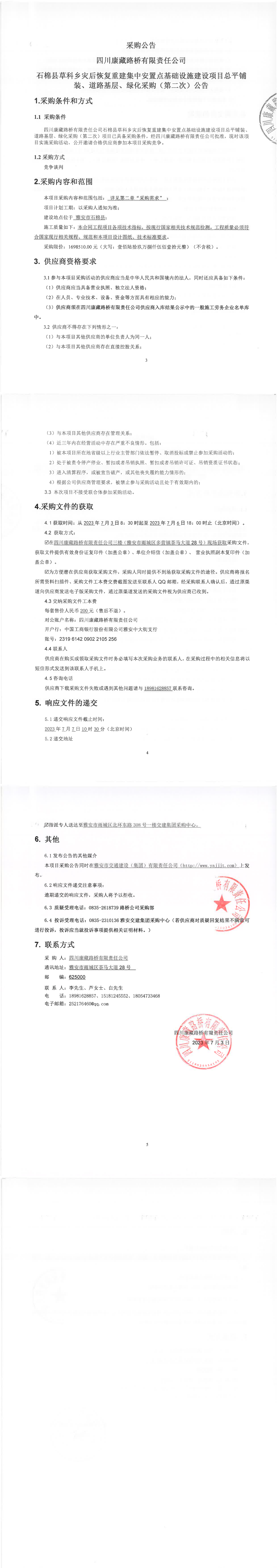 四川康藏路橋有限責任公司石棉縣草科鄉(xiāng)災(zāi)后恢復(fù)重建集中安置點基礎(chǔ)設(shè)施建設(shè)項目總平鋪裝、道路基層、綠化采購流標通知