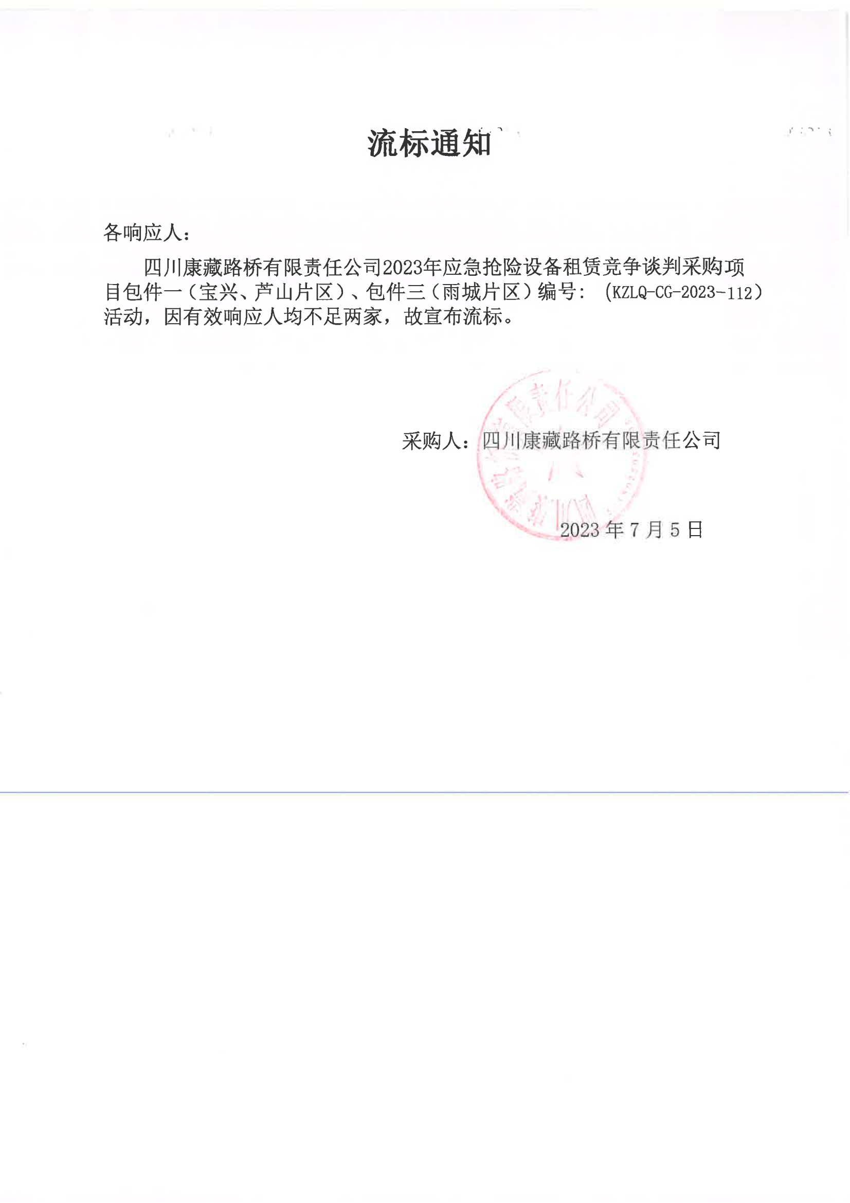 四川康藏路橋有限責(zé)任公司2023年應(yīng)急搶險設(shè)備租賃競爭談判采購項目包件一(寶興、蘆山片區(qū))、包件三(雨城片區(qū))流標(biāo)通知