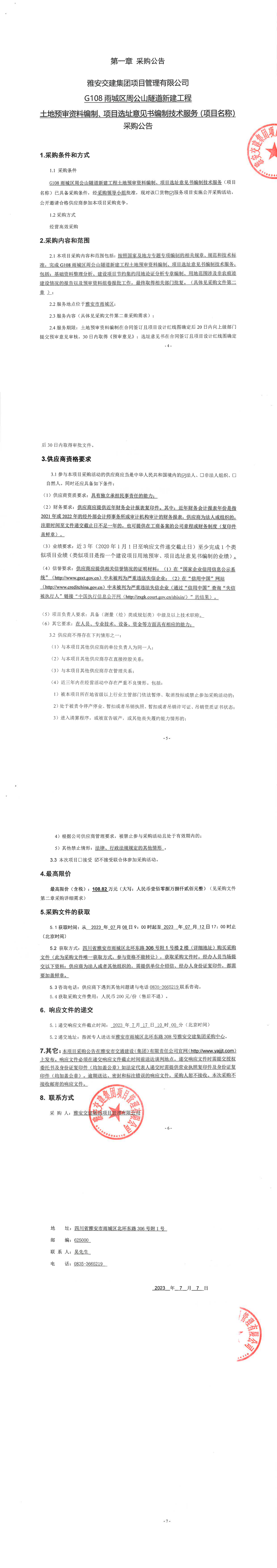 雅安交建集團項目管理有限公司G108雨城區(qū)周公山隧道新建工程土地預審資料編制、項目選址意見書編制技術服務(項目名稱)采購公告