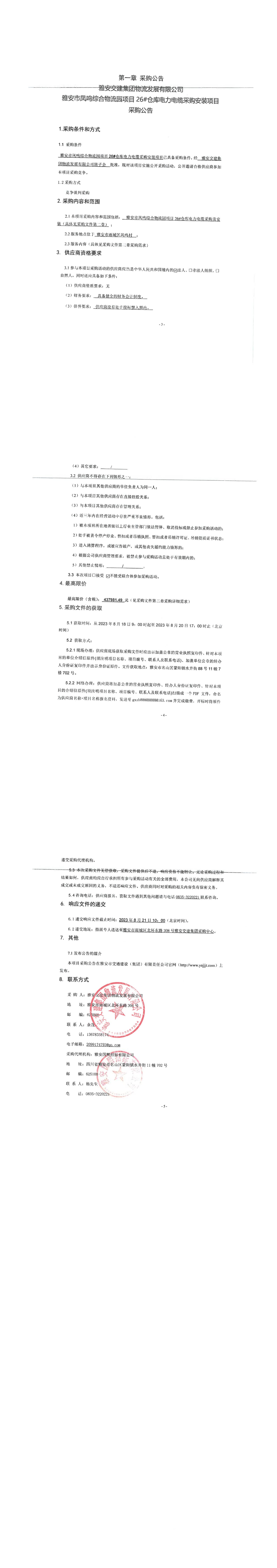 雅安交建集團(tuán)物流發(fā)展有限公司雅安市鳳鳴綜合物流園項(xiàng)目26#倉(cāng)庫(kù)電力電纜采購(gòu)安裝項(xiàng)目采購(gòu)公告
