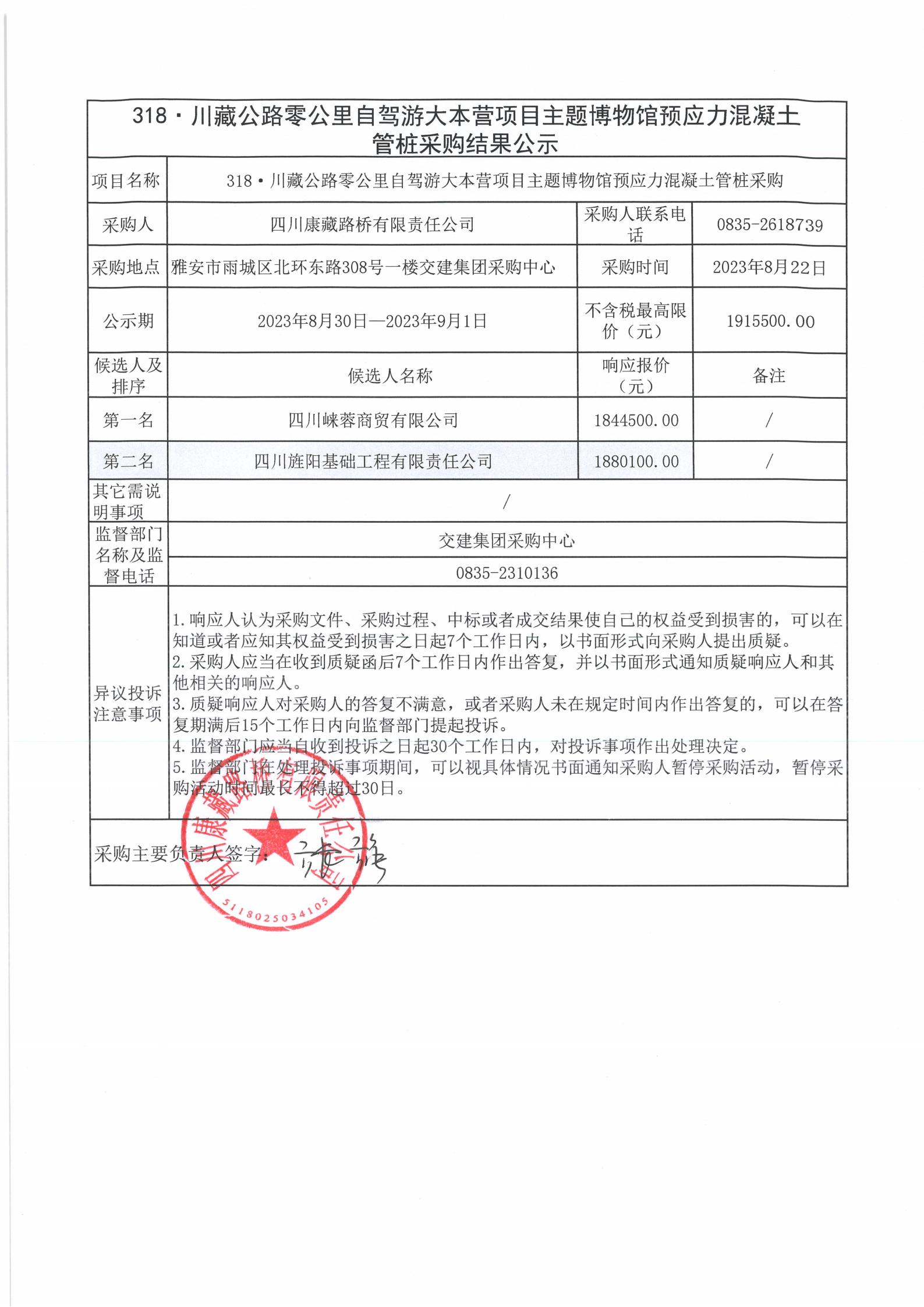 四川康藏路橋有限責任公司318·川藏公路零公里自駕游大本營項目主題博物館預應力混凝土管樁采購結果公示