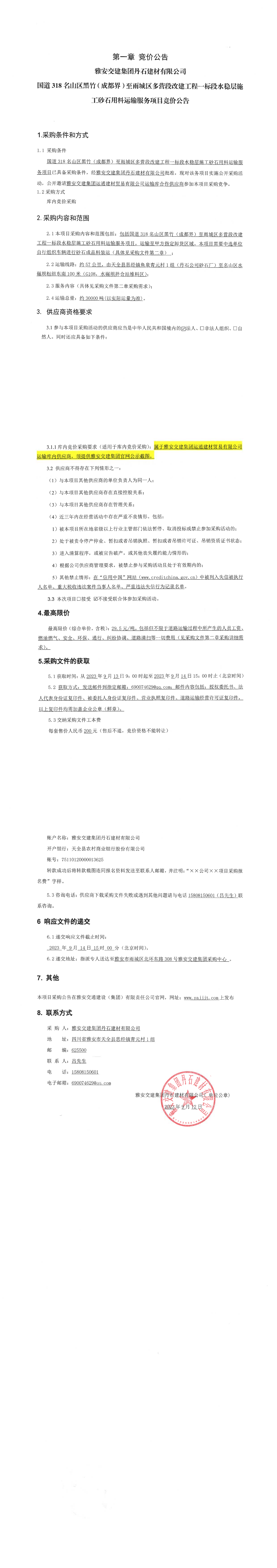 雅安交建集團丹石建材有限公司國道318名山區(qū)黑竹(成都界)至雨城區(qū)多營段改建工程一標(biāo)段水穩(wěn)層施工砂石用料運輸服務(wù)項目競價公告