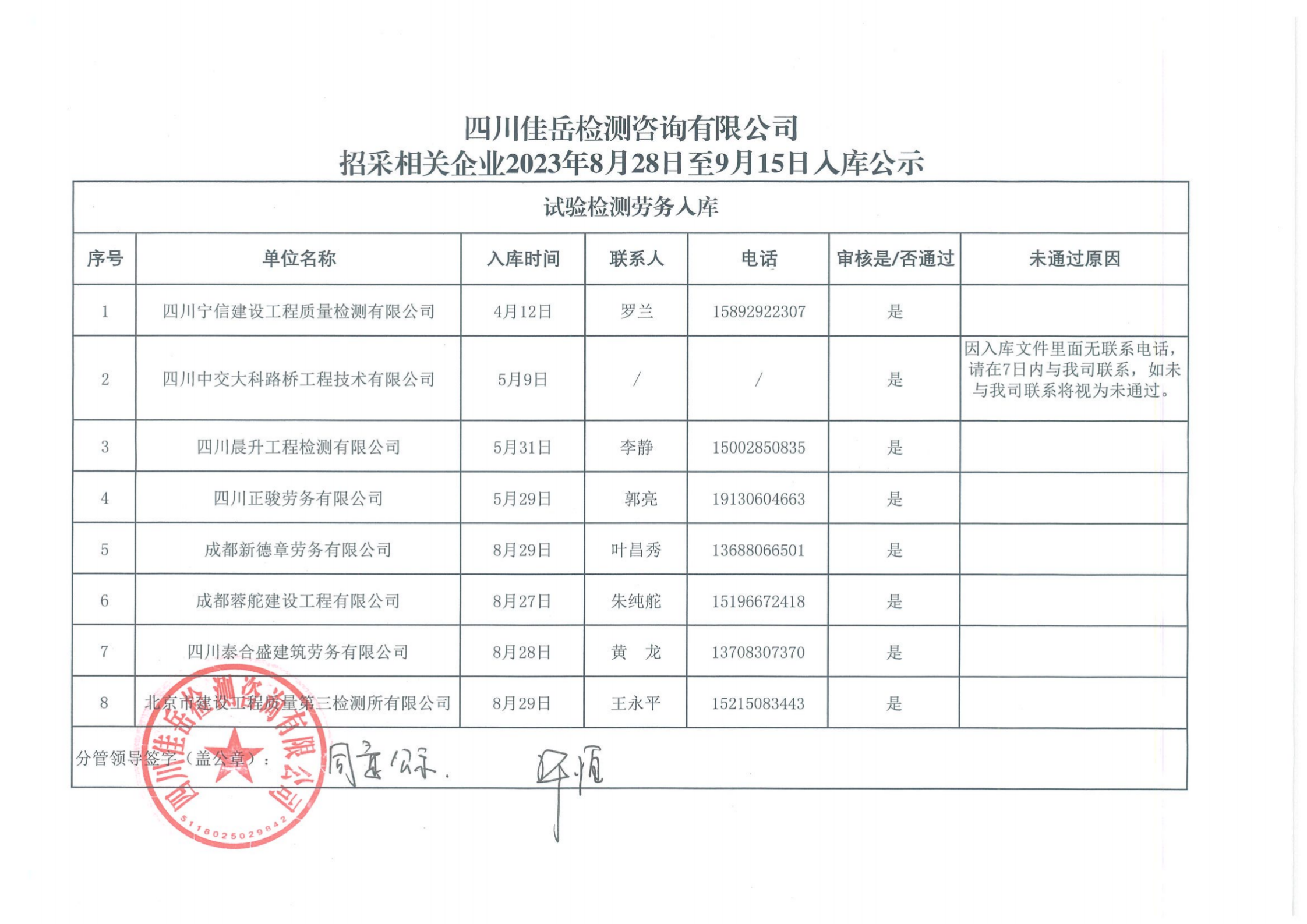 四川佳岳檢測咨詢有限公司招采相關企業(yè)2023年8月28日至9月15日入庫結果公示