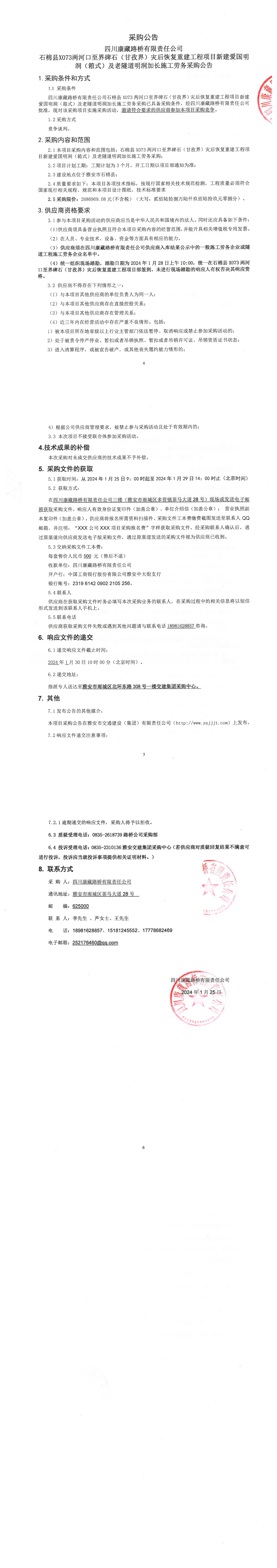 四川康藏路橋有限責任公司石棉縣X73兩河口至界碑石(甘孜界)災后恢復重建工程項目新建愛國明洞(箱式)及老隧道明洞加長施工勞務采購公告