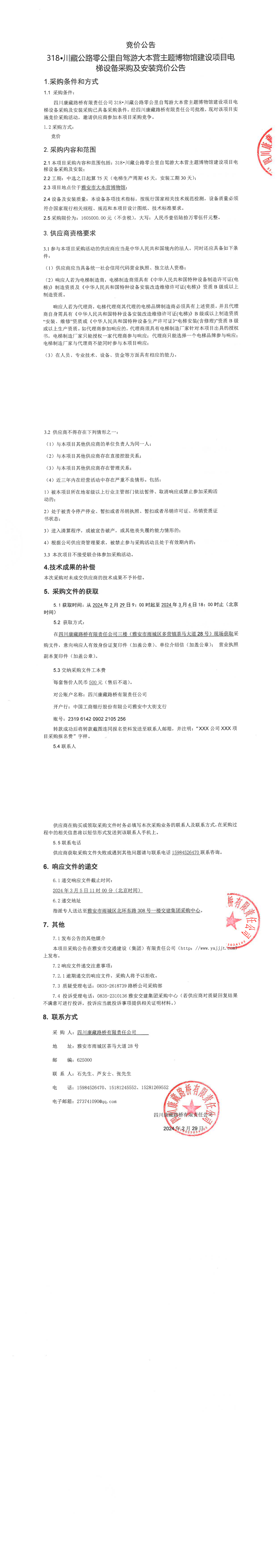 四川康藏路橋有限責(zé)任公司318·川藏公路零公里自駕游大本營主題博物館建設(shè)項(xiàng)目電梯設(shè)備采購及安裝競價(jià)公告