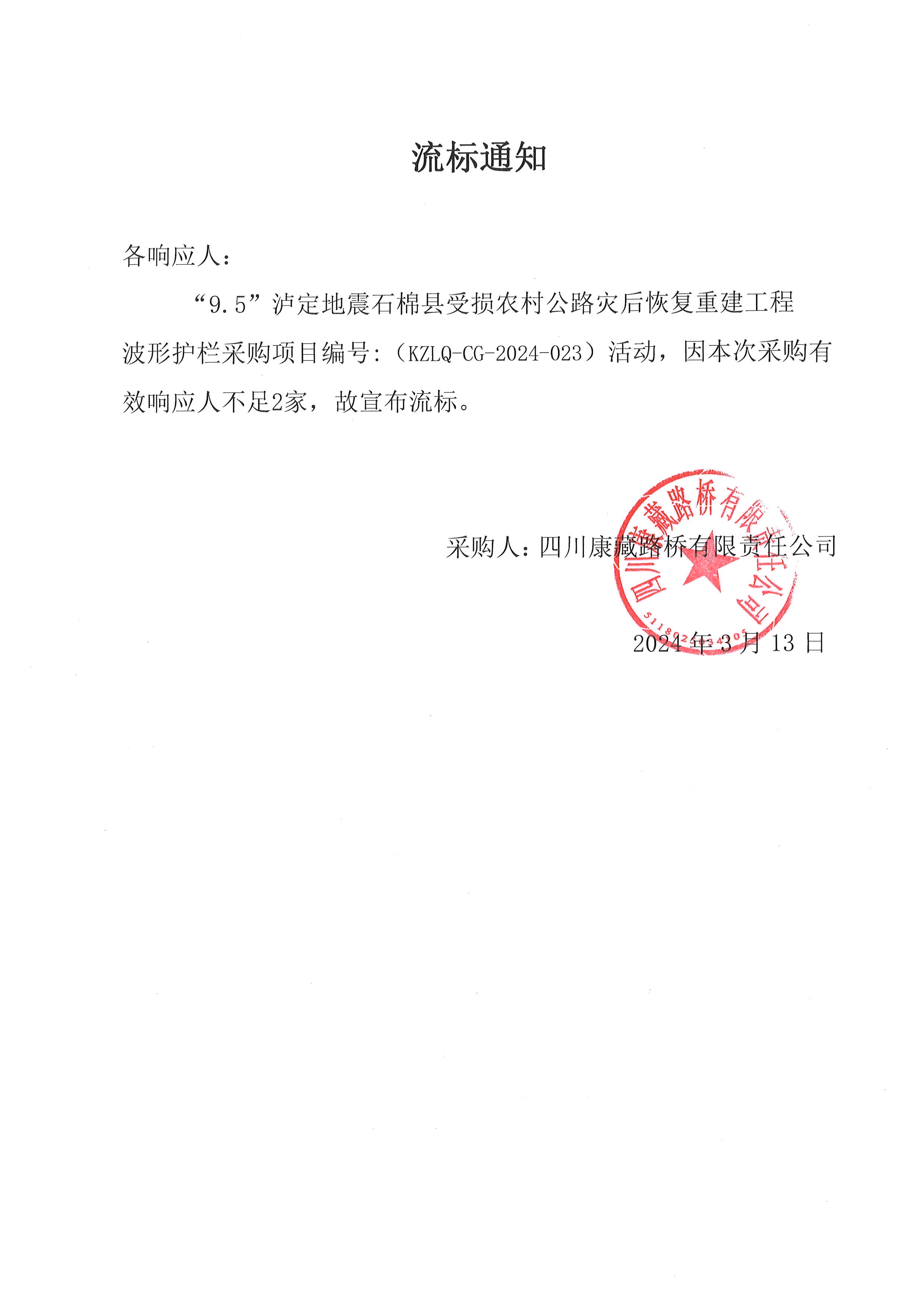 四川康藏路橋有限責(zé)任公司“9.5”瀘定地震石棉縣受損農(nóng)村公路災(zāi)后恢復(fù)重建工程波形護欄采購流標(biāo)通知