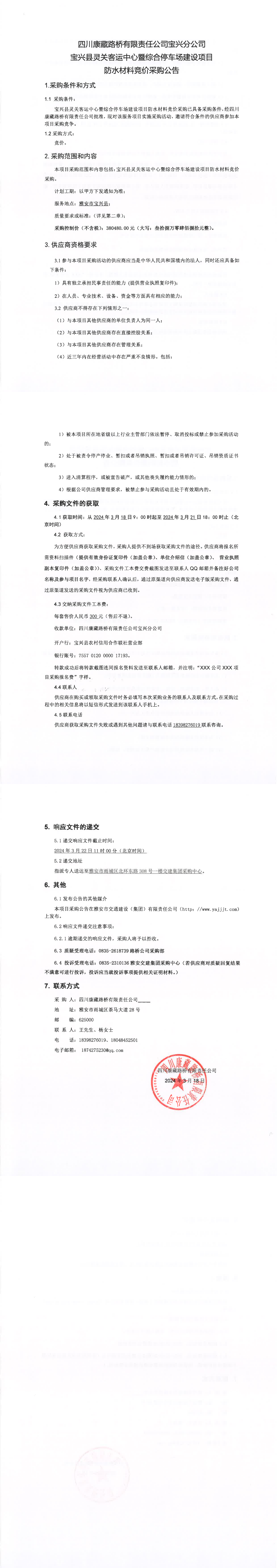 四川康藏路橋有限責(zé)任公司寶興縣靈關(guān)客運(yùn)中心暨綜合停車場(chǎng)建設(shè)項(xiàng)目防水材料競(jìng)價(jià)采購公告
