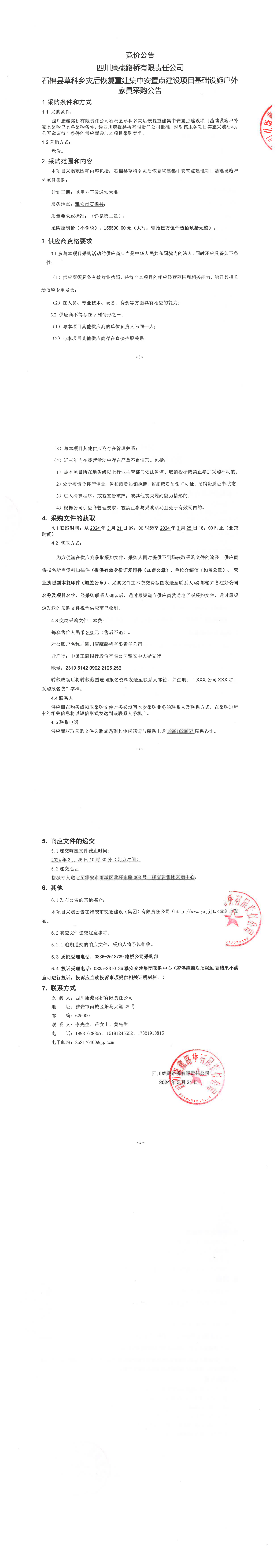 四川康藏路橋有限責(zé)任公司石棉縣草科鄉(xiāng)災(zāi)后恢復(fù)重建集中安置點(diǎn)建設(shè)項(xiàng)目基礎(chǔ)設(shè)施戶外家具采購(gòu)公告