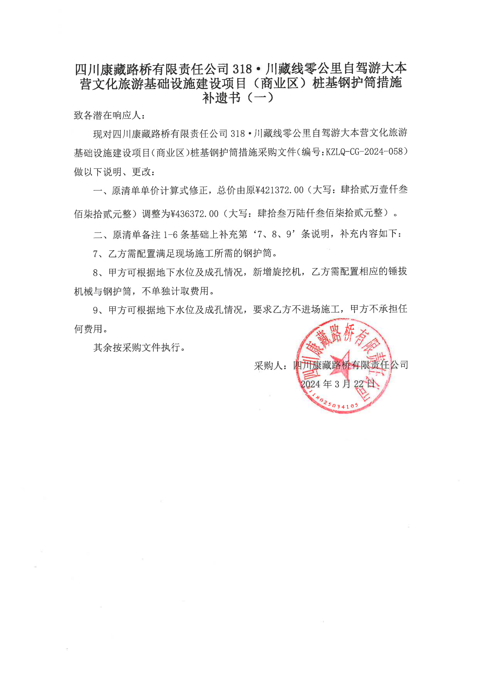 四川康藏路橋有限責(zé)任公司318·川藏公路零公里自駕游大本營文化旅游基礎(chǔ)設(shè)施建設(shè)項目(商業(yè)區(qū))樁基鋼護(hù)筒措施補遺書(一)