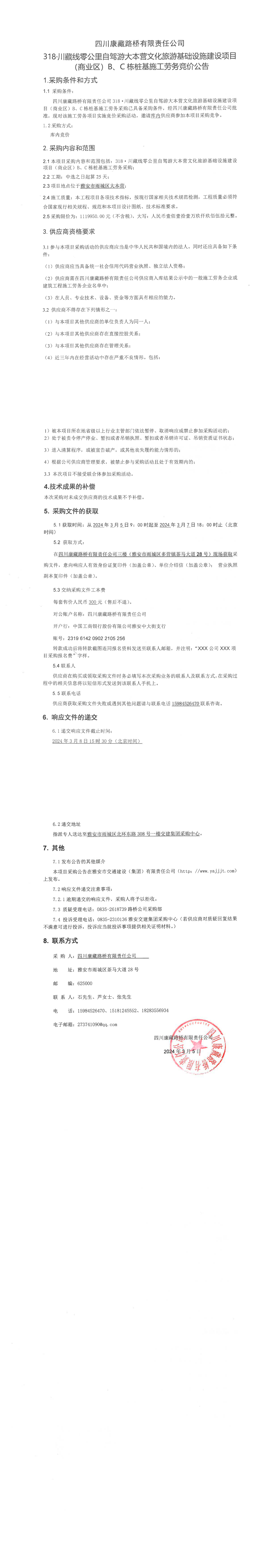 四川康藏路橋有限責(zé)任公司318·川藏公路零公里自駕游大本營文化旅游基礎(chǔ)設(shè)施建設(shè)項目(商業(yè)區(qū))B\C棟樁基施工勞務(wù)競價公告